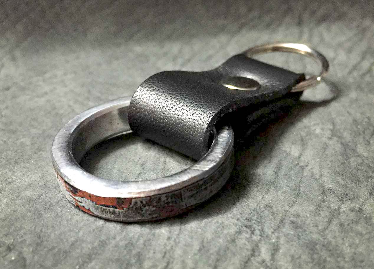 Ein außergewöhliches Rahmenstück, einer 45er Knucklehead. Das Oberflächenfinish ist rost-braun. Bikes mit diesen Motoren gehören heute zu den begehrtesten Oldtimern von Harley-Davidson. Da mein Rahmenstück auf einer Seite eingedellt ist, passt der Ring auf keinen Finger und wird deshalb mit einer 3 mm starken Leder-Halskette ausgeliefert. Das Band lässt sich sehr einfach mit einem verchromten Steckverschluss im Nacken schließen.