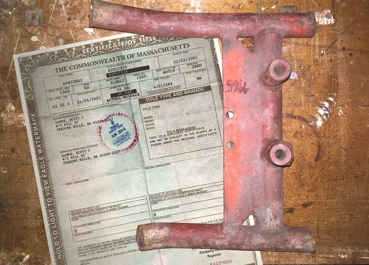 Ab 1957 wurde der neue, leichtere Harley Davidson Sportster-Motor in Serie gebaut. Mein Rahmen hier stammt aus der letzten Baureihe, die mit 883 CUI und den namensgebenden Grauguss-Zylinderköpfen ausgeliefert wurde. Produktionsbedingt ist beim Gießen dieses Rahmens das Metall ungleichmäßig verlaufen. So ist ein wirklich einmaliges Design entstanden. Wie als Hommage an seinen Zulassungsort Kalifornien zeigen einige dieser Ringe im Querschnitt eine Welle des Nord-Pazifiks – für Surfer und Harley-Fahrer ein Must-have!