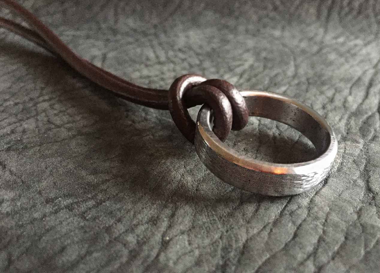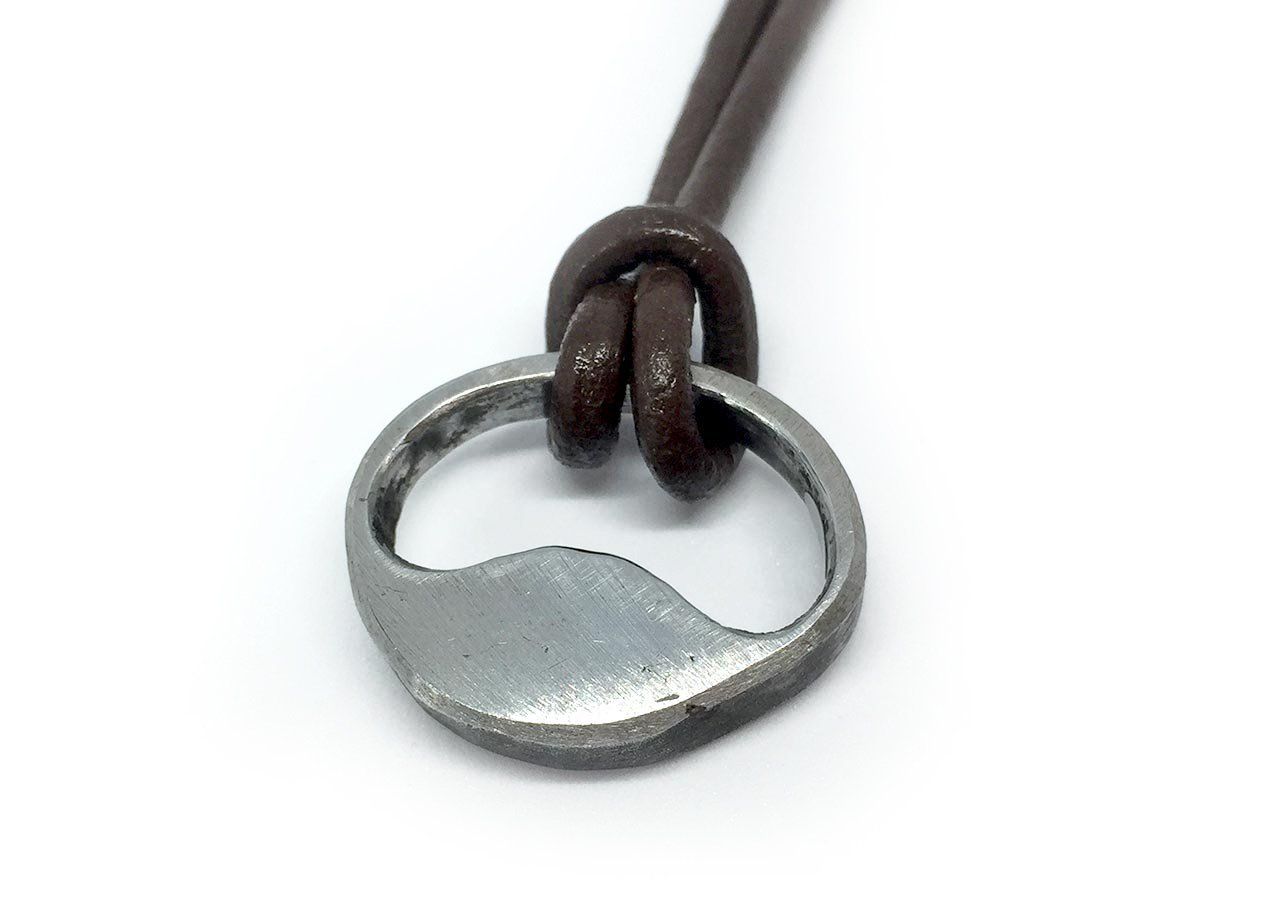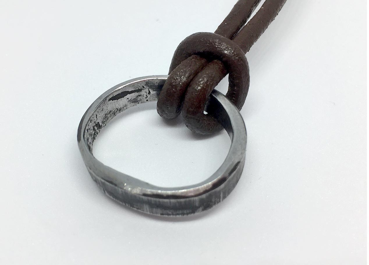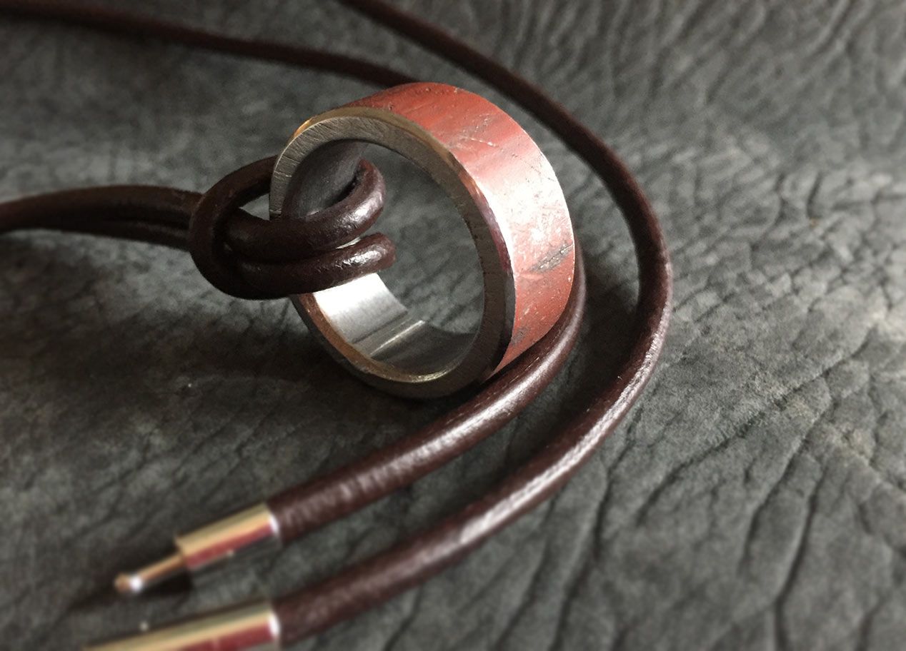 Ein außergewöhliches Rahmenstück, einer 45er Knucklehead. Das Oberflächenfinish ist rost-braun. Bikes mit diesen Motoren gehören heute zu den begehrtesten Oldtimern von Harley-Davidson. Da mein Rahmenstück auf einer Seite eingedellt ist, passt der Ring auf keinen Finger und wird deshalb mit einer 3 mm starken Leder-Halskette ausgeliefert. Das Band lässt sich sehr einfach mit einem verchromten Steckverschluss im Nacken schließen.