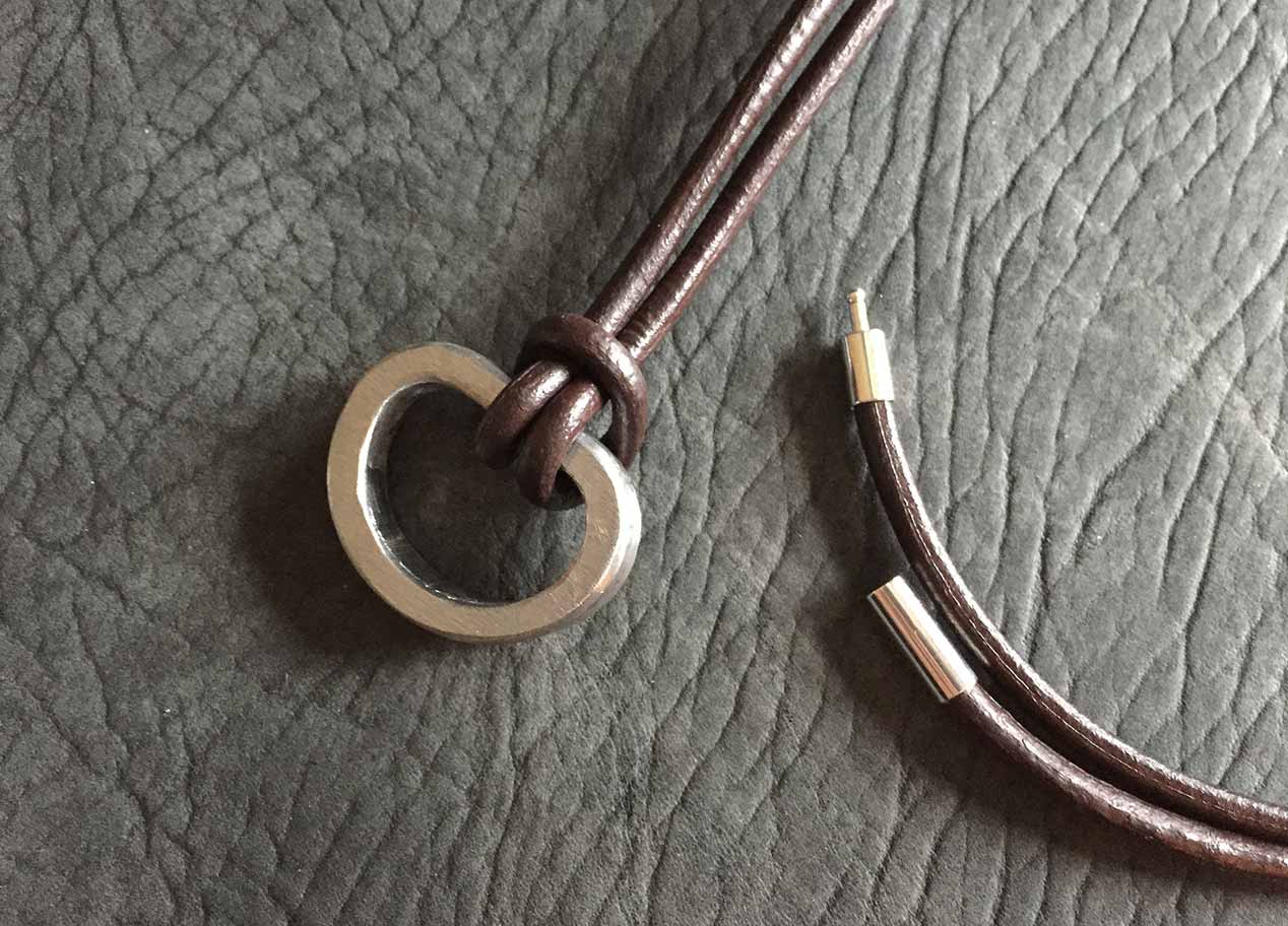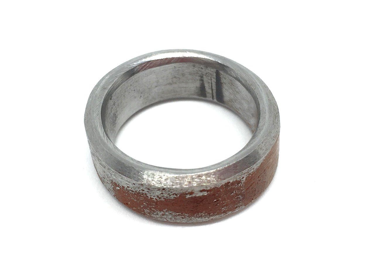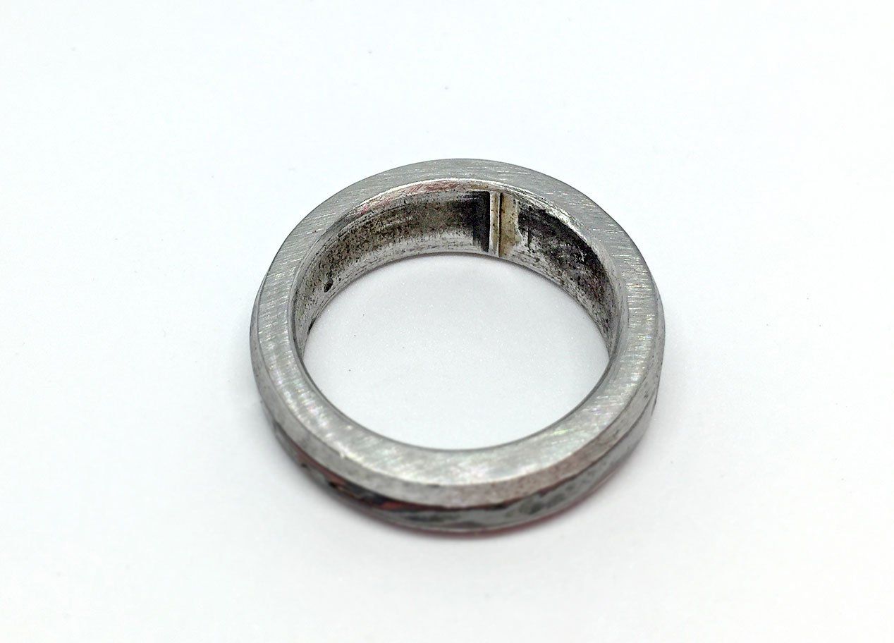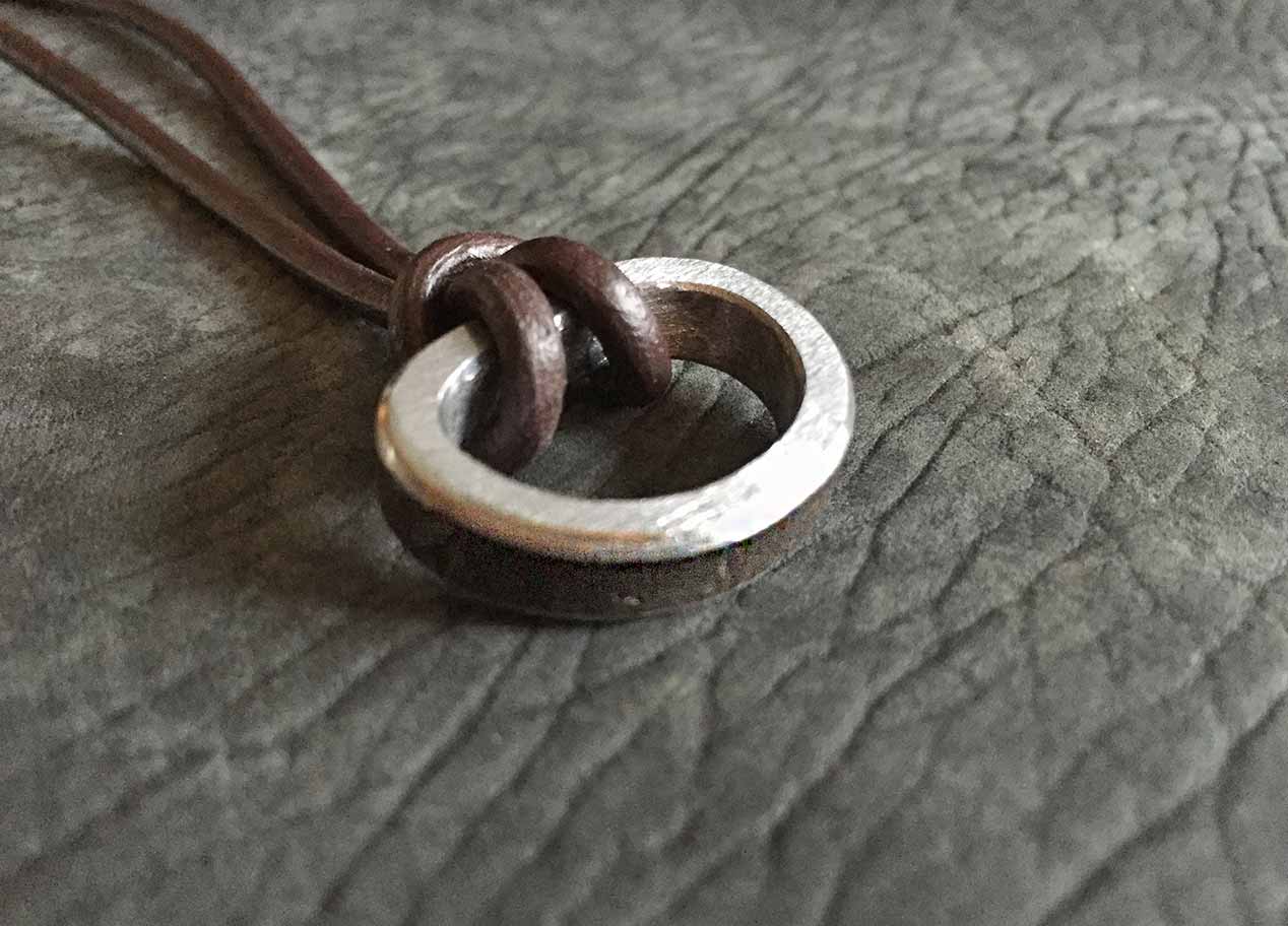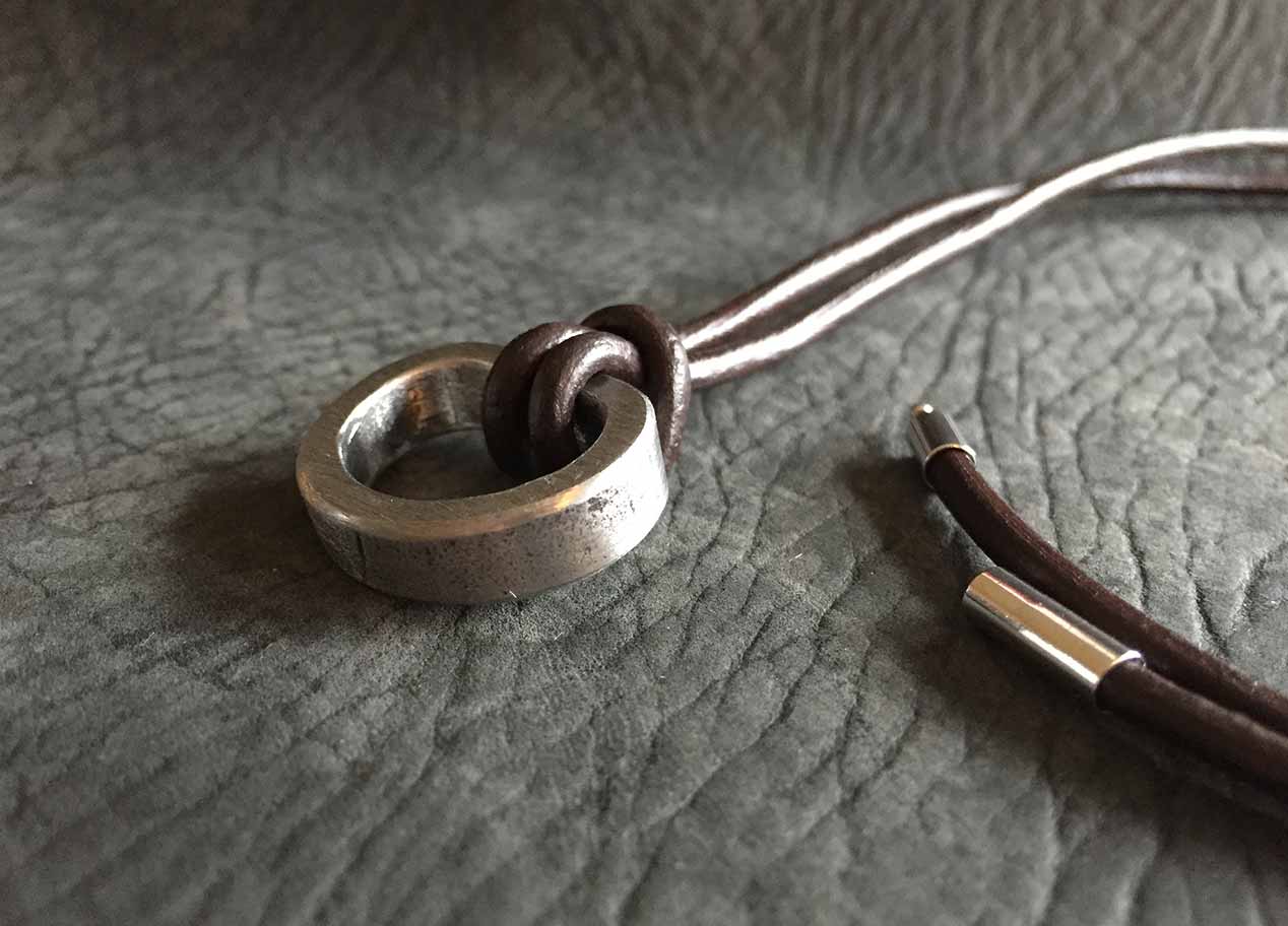 Ein außergewöhliches Rahmenstück, einer 45er Knucklehead. Das Oberflächenfinish ist rost-braun. Bikes mit diesen Motoren gehören heute zu den begehrtesten Oldtimern von Harley-Davidson. Da mein Rahmenstück auf einer Seite eingedellt ist, passt der Ring auf keinen Finger und wird deshalb mit einer 3 mm starken Leder-Halskette ausgeliefert. Das Band lässt sich sehr einfach mit einem verchromten Steckverschluss im Nacken schließen.