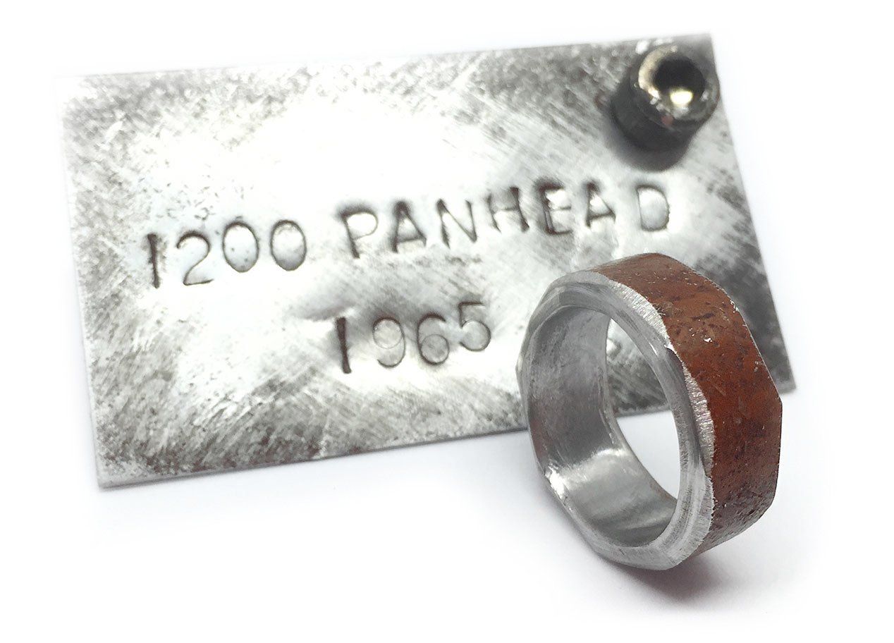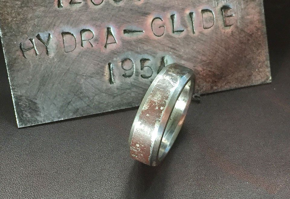 1964 bekam der mitlerweile 17 Jahre alte Panhead-Motor ein sogenanntes “electric leg” verpasst – einen elektronischen Startermotor. Folgerichtig nannte man das Model "Electra-Glide". Das 1965er Modell war die letzte "Außenöler" von Harley Davidson und ist sowohl bei Sammlern als auch Fahrern sehr begehrt. Ich habe ein Reststück einer rostroten Machine aus Massachusetts bekommen und baue Euch daraus wunderschöne Ringe ;-)