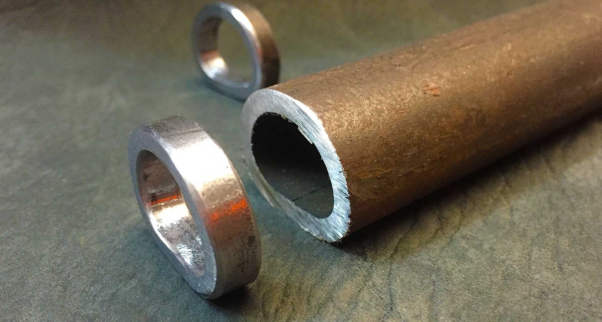 Nur wenige Zentimeter Rahmenrohr, die mir vorliegen (Reststücke mit Briefkopie) bilden das Ausgangsmaterial dieser Ringe. Jeder ist ein Unikat – und wenn alle dann alle! 😉